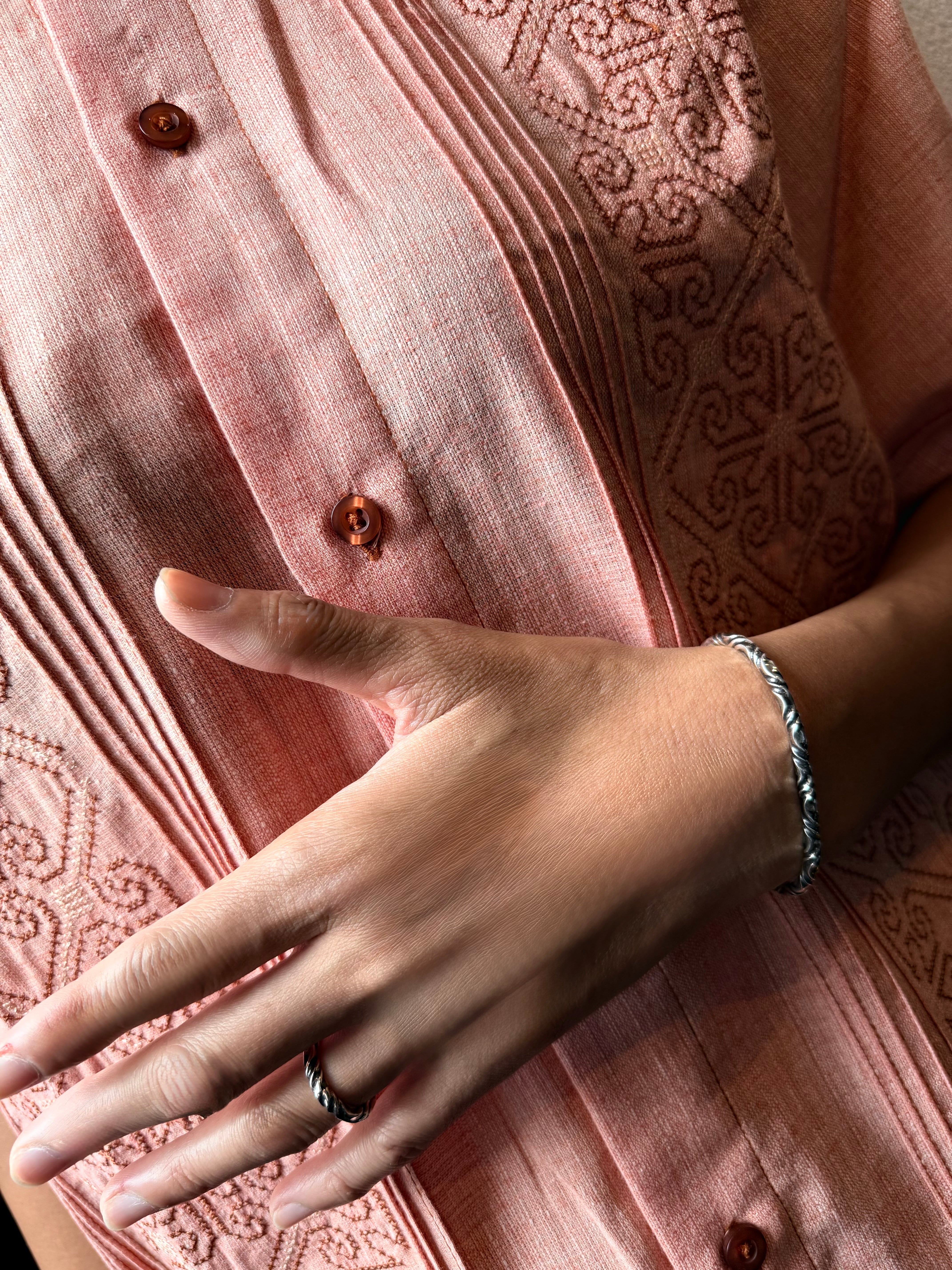 この繊細なバングルは、二つの美しいバレルがアシンメトリーにデザインされており、装った瞬間に特別な魅力を引き出します。